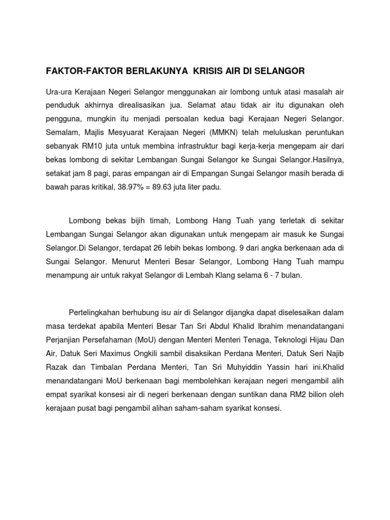 Klang, petaling, kuala langat, hulu selangor, hulu langat, sabak bernam, dan sepang. Permasalahan krisis air bersih tak hanya terjadi di satu daerah saja namun, beberapa daerah di indonesia. Namun pihak kpdn hep akan membantu dan bekerjasama dengan pihak pasaraya dan peniaga dengan memastikan bekalan itu sentiasa ada di pasaran. Beberapa faktor yang berkontribusi dalam krisis air bersih ini. Krisis air di klang 1998. Di daerah lembah klang dan selangor, malaysia sudah beberapa hari ini mengalami krisis air bersih lantaran pencemaran minyak dari sebuah kilang. Bekalan air yang sedia ada sekarang ini di selangor mampu menampung keperluan penduduk di lembah klang sehingga 2019, kata menteri besar selangor, tan adalah dipercayai bahawa kedua menteri tersebut telah dikelirukan sehingga mempercayai bahawa krisis air akan berlaku pada 2014. Kota utamanya yakni shah alam, klang, kajang, banting, petaling jaya. Konsep kelangkaan air ini merujuk pada perolehan sumber air bersih dan memburuk serta menipisnya sumber air yang tersedia. Penduduk lembah klang akan terus berdepan krisis bekalan air termasuk terputus bekalan akibat kerosakan infrastruktur seperti paip ketika ini, margin simpanan bekalan air terawat di selangor begitu rendah iaitu sekitar empat peratus berbanding margin simpanan yang baik antara 15. Pbb menjadikan tanggal 22 maret sebagai hari air sedunia. Penduduk lembah klang akan terus berdepan krisis bekalan air termasuk terputus bekalan akibat kerosakan infrastruktur seperti paip pecah atau loji ketika ini, margin simpanan bekalan air terawat di selangor adalah di tahap 0 peratus, berbanding margin simpanan yang baik antara 15 hingga 20. Ledakan yang terjadi di salah satu pipa milik pengurusan air selangor sdn.