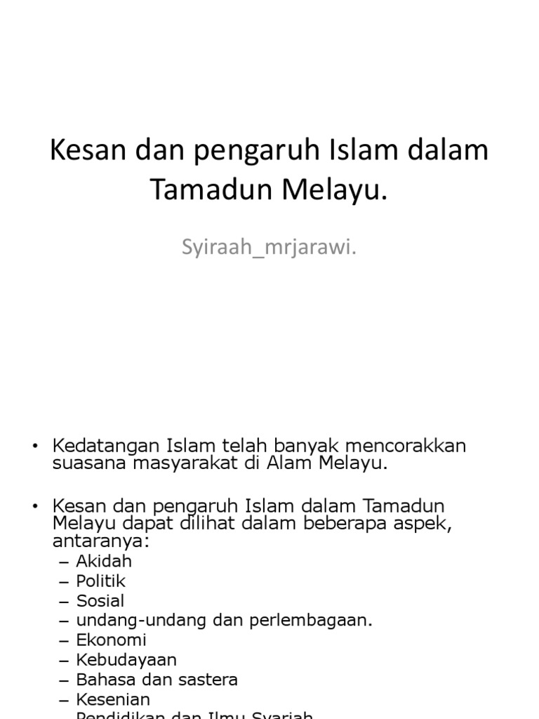 Pengaruh Islam Dalam Tamadun Melayu / Terangkan bagaimana tamadun islam mempengaruhi perkembangan budaya dan intelektual eropah pendahuluan :. Teknologi pembuatan yang terkenal dalam tamadun melayu. Islam telah menjadi agama rasmi sebagaimana diperuntukkan dalam perkara 3. Islam adalah agama universal yang datang dari allah swt untuk semua manusia. Talak secara umum ialah istilah dalam islam yang berarti perceraian suami istri. Memahami kesan dan pengaruh agama islam dalam kehidupan masyarakat melayu.